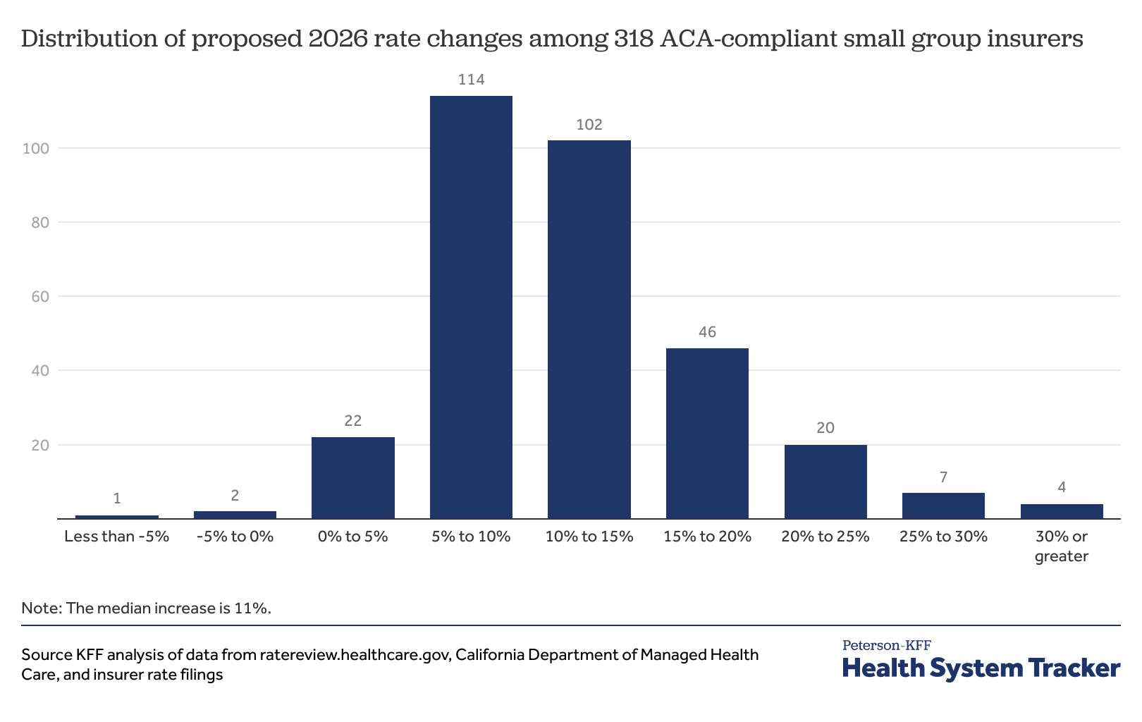 9月24日、KFFは、2026年の小規模グループ保険プランの保険料に関する調査結果を公表した。それによると、2026年の小規模グループ保険プランの保険料伸び率中位数は11%であった。伸び率が高まった理由としては、などが挙げられている。