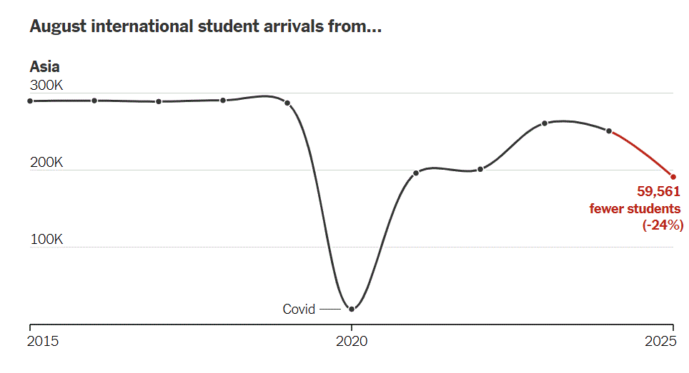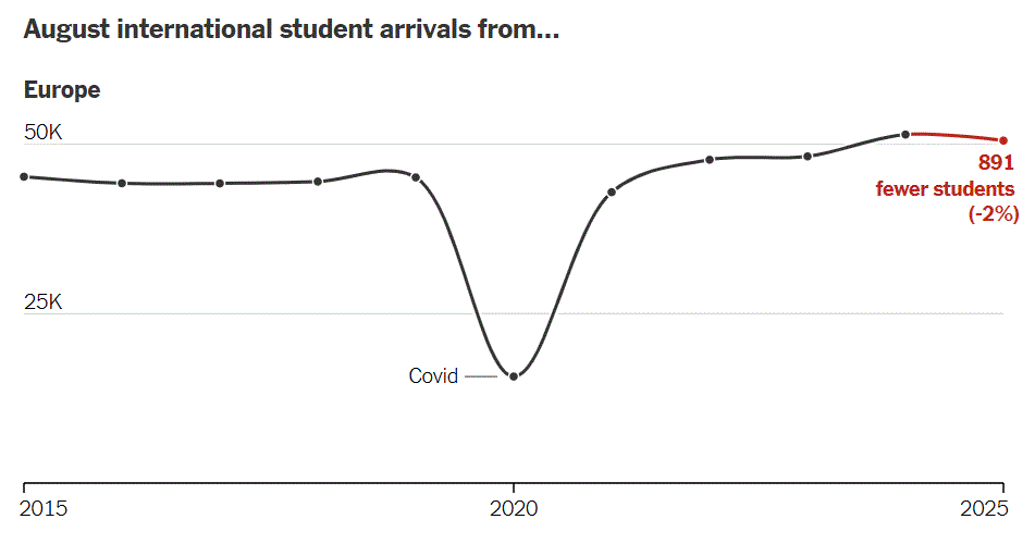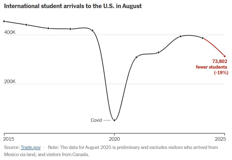 Source : | Nearly 20 Percent Fewer International Students Traveled to the U.S. in August (New York Times) |