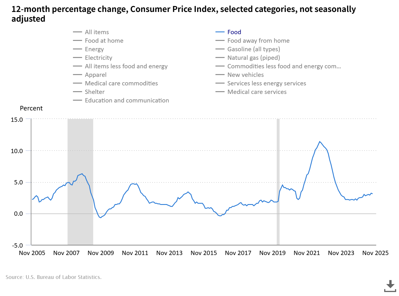 12月18日、BLSは11月の消費者物価指数(CPI-U)を公表した。前年同月比2.7%の上昇と、9月の上昇率から低下した(「Topics2025年11月22日(2) CPI上昇続くも」参照)。FRBの政策金利引き下げを裏付けるような結果となった(「Topics2025年12月12日(2) インフレ懸念>失業懸念」参照)。コアの伸び率は2.6%と低下した。なお、10月分の公表はない。足許については9月比でプラスの0.2と、若干の低下となった。