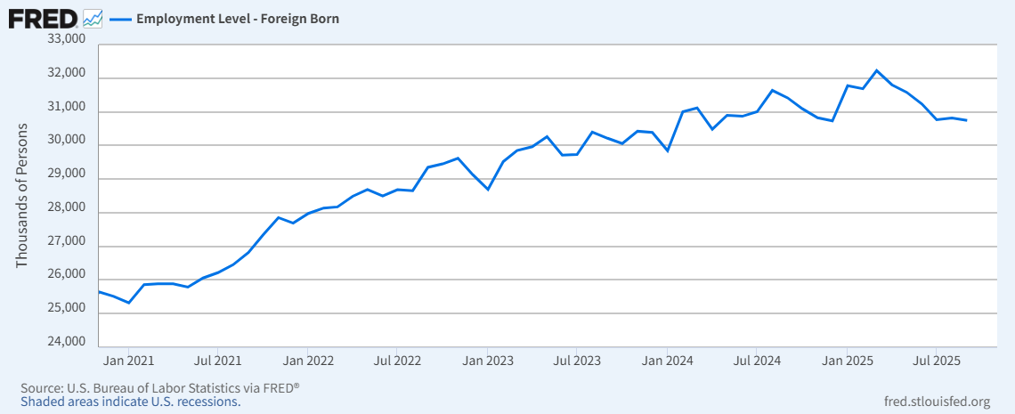 11月の雇用者数は159.6M人となった(Table B-1. Employees on nonfarm payrolls by industry sector and selected industry detail)。業種別増加数は次の通り。医療、建設業で増加、製造業、レジャー観光業は、減少となった。失業率は4.6%に上昇(10月の数値はなし)(Table A-1. Employment status of the civilian population by sex and age)。労働市場参加率は今月も62.5%に上昇した。25~54歳の労働市場参加率は83.8%と上昇した(BLS)。労働市場に参加していない人の中で仕事を得たいと考えている人数は増加した。長期失業者(27週以上)の失業者全体に占める割合は、24.3%と低下した。一方、外国人雇用者数は、減少傾向が明確になってきた。上記sourceでは、雇用増の勢いが低下してきた理由を、2つ挙げている。![]()