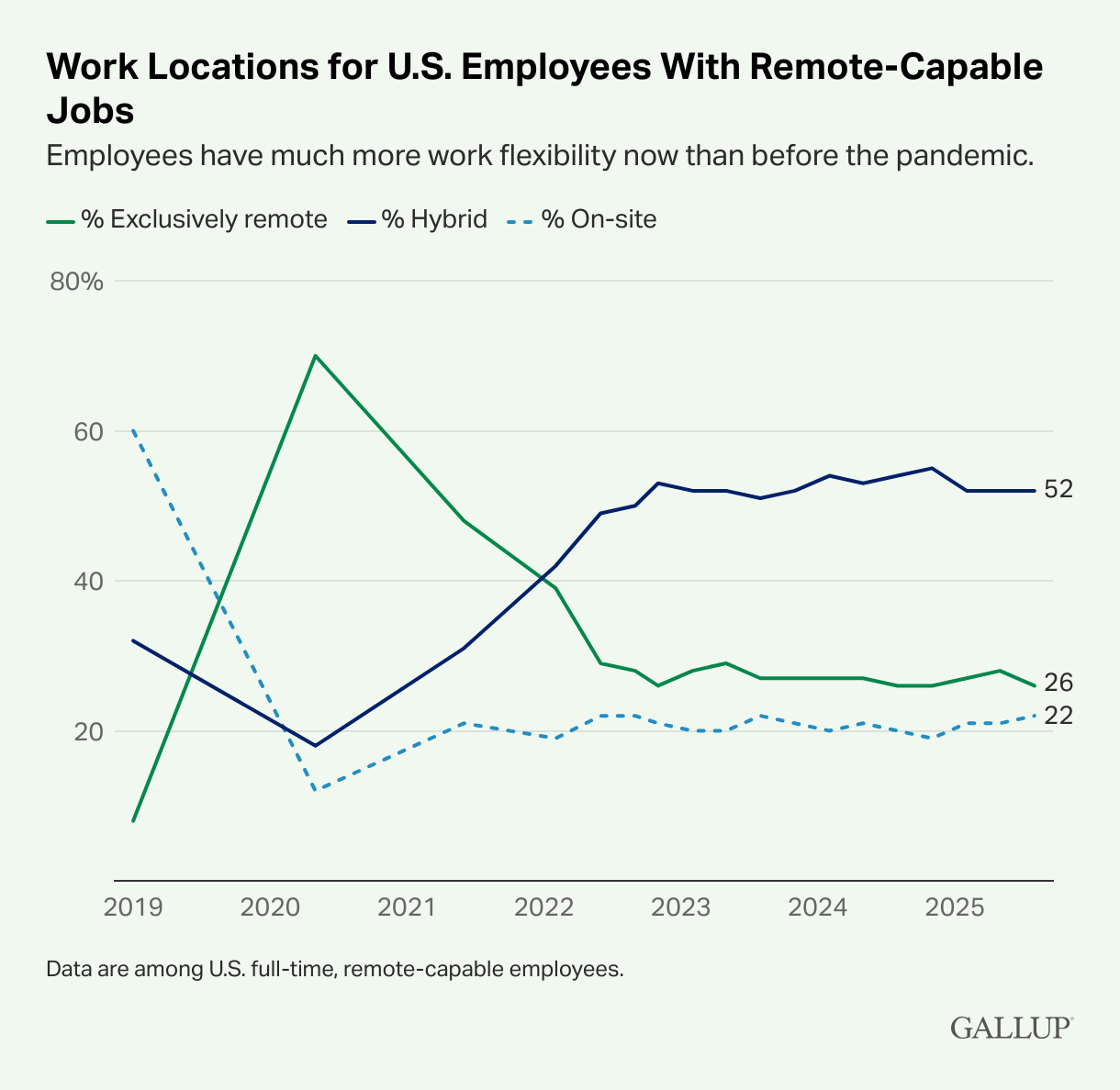 パンデミックが終息してほぼ3年が経過し、従業員の働く場所は一定の傾向が定まってきたようだ。GALLUP社の調査では、在宅勤務が可能な場合、従業員が実際に働いている場所は、となっている(2025年8月時点)。