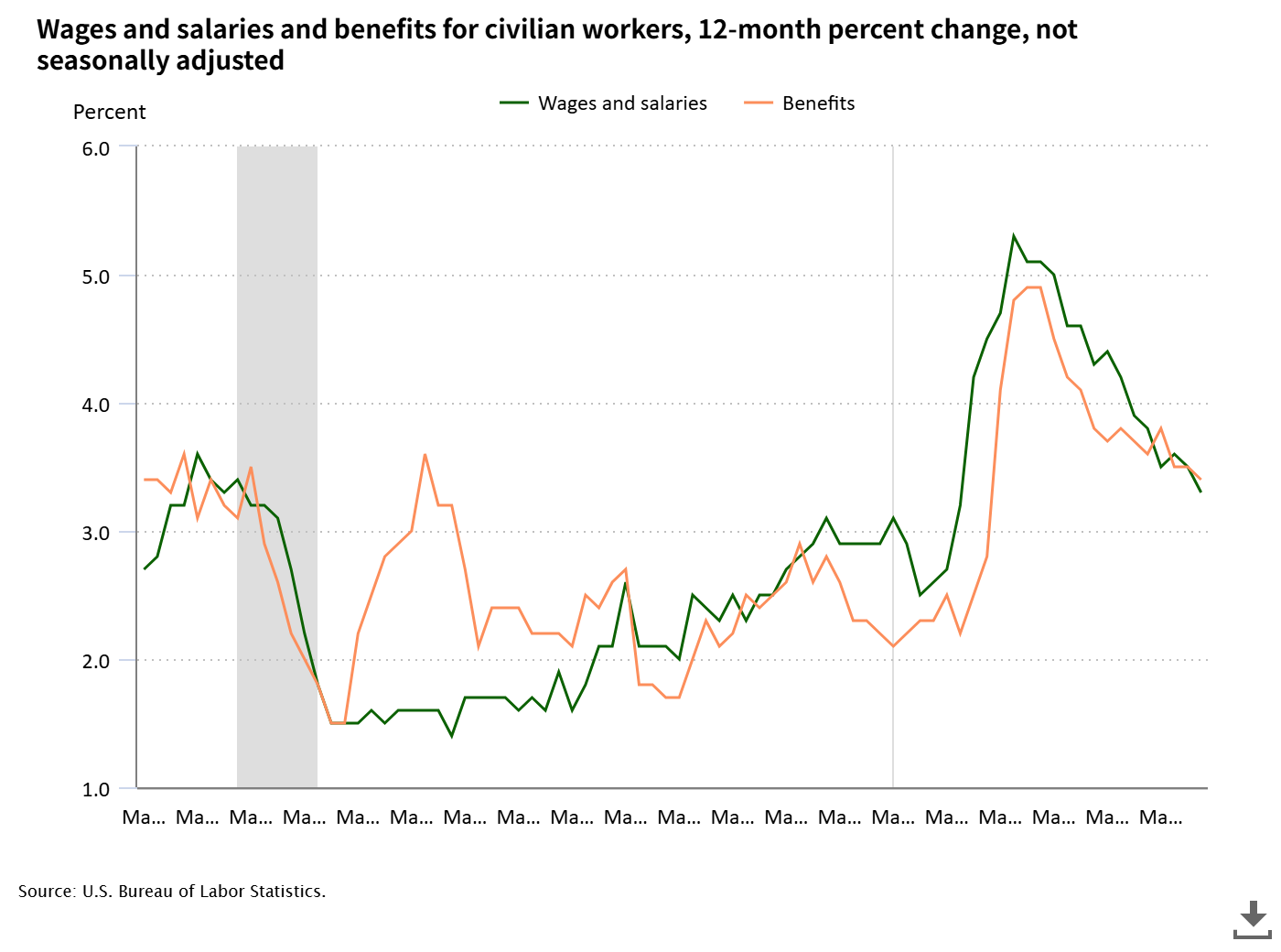 2月10日、12月のEmployment Cost Index(ECI)が公表された。 雇用市場全体の雇用コストは前年同期比3.4%増(「Topics2025年12月12日(1) ECI伸び低下続く」参照)。 民間セクターの賃金の伸び率は一進一退の状況。 足許の3ヵ月前との比較では、官民ともに伸び率が低下傾向となっている。 労働市場の需給は、緩和傾向を示している。 ※ 参考テーマ「労働市場」