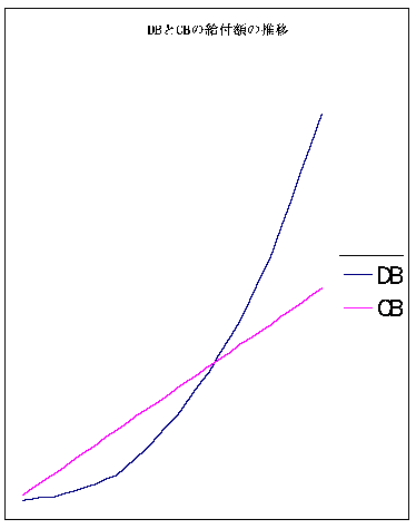 - 典型的なDBの年金額は、最終給与平均、勤続年数により算出されるが、CBの場合は、拠出ポイントと利子ポイントの累積により算出される。従って最終的な年金額(一時金)は、運用実績により左右される。→DC