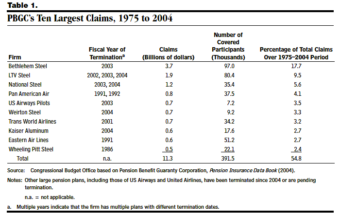 - 1975年から2004年の間に移管されたプランのうち、PBGC負担の大きい順に並べたトップ10は、次の通り。これらに加え、US Airwaysの全年金プランを$3Bで引き継いだ。またUALのプランを$6B以上で引き継ぐことで合意した(「Topics2005年4月28日 UAL年金のPBGC行き決定」参照)。