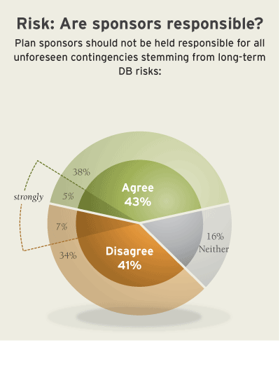 - 予測不可能な財政的リスクに対する責任を誰が負うべきかについては、意見が分かれている。DBプランにまつわるすべてのリスクを企業が考慮することはできない点ではほぼ一致するものの、実際に負担を負うべきかどうかについては一致していない。