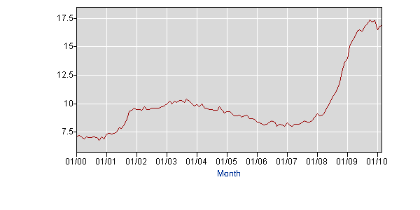 このように、本来であればフルタイムでの雇用を求めていながらパートタイムで就職している人たちも多い。また、本当なら働きたいのに、就職が難しいので諦めてしまった人達もいる。以前にも紹介した(「Topics2010年3月6日(3) 真実に近い失業率」参照)が、こうした不本意なパートタイム就労者、不労者も含めた失業率も見ておく必要がある。