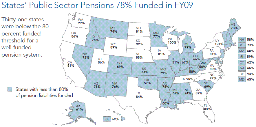 給付債務割引率 積立不足額 上記試算(8%) $ 1.26T 企業年金と同様の前提 $ 1.8T 30年物国債 $ 2.4T - 年金プランについては、総体で積立比率は78%と、2008年度の84%から大きく低下した。うち、100%を超えているのはNY州(101%)のみであり、最低はIL州の51%、WV州の56%である。なお、GAOは少なくとも80%を保つように推奨しているが、この水準を下回った州は全部で31州と、2008年度の22州から劇的に増えている。
