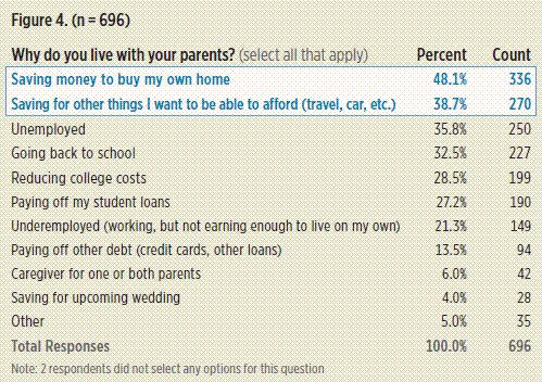 - 親と同居している理由は、出費を抑えるためというのが多いのだが、失業中(unemployed)、または稼ぎが少なく独立できない(underemployed)、というのもかなりの割合を占めている。
