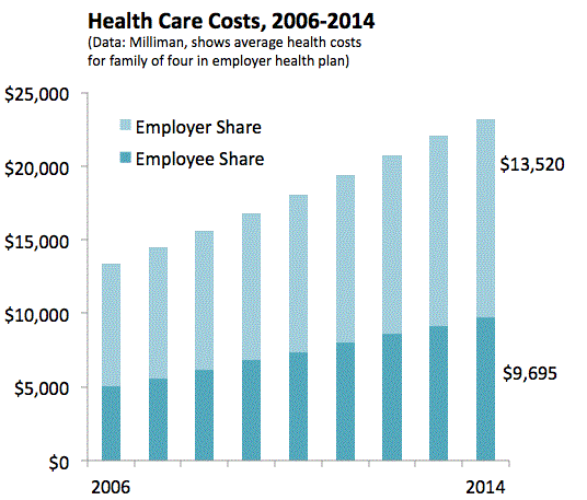 4人家族で企業提供医療保険プランに加入している場合、従業員の年間医療費負担は$9,695(2014年)と推計されている。保険料、窓口負担などで年間100万円程度の負担をしていることになる。