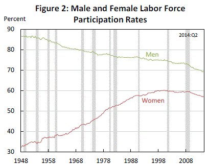 まずは、2007年以降の労働参加率低下の要因を3つ挙げている。また、男女別の労働参加率をみると、先の景気後退期、2007年4Q以降、女性の労働参加率が低下しているのが目立つ(「Topics2014年7月14日 中堅女性の労働市場退出」参照)。