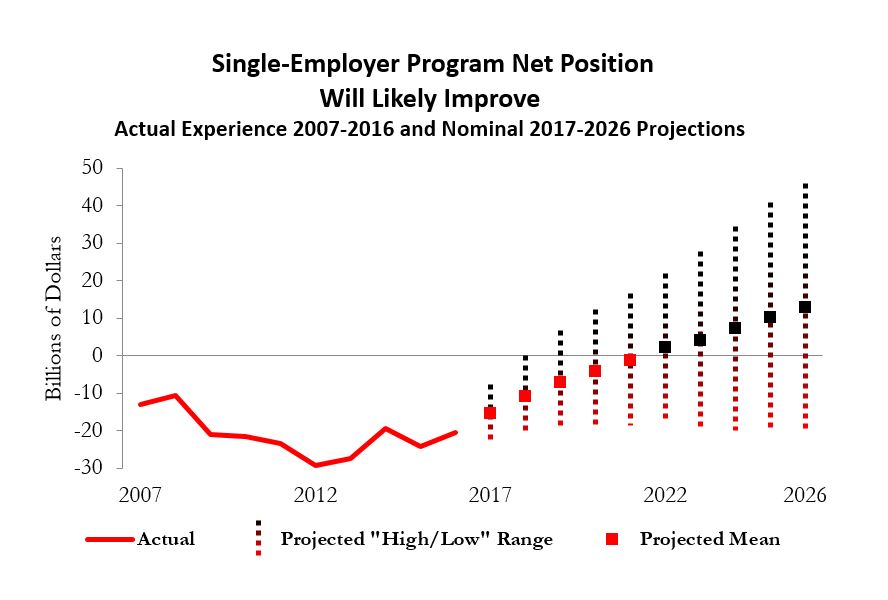 複数事業主プランは、2025年に破綻する見込みとなっている。これは昨年のレポートから変わっていない。他方、単独事業主プランは、収益が改善していき、2022年には黒字化すると見込まれている。一連の改善策の効果が出始めているのだろう。なお、トランプ大統領が予算教書で提案した、複数事業主プランに対する可変保険料と退出保険料が導入されれば、今後10年間で$16Bの増収となると見込んでいる(「Topics2017年5月25日 予算教書:年金関係提案」参照)。