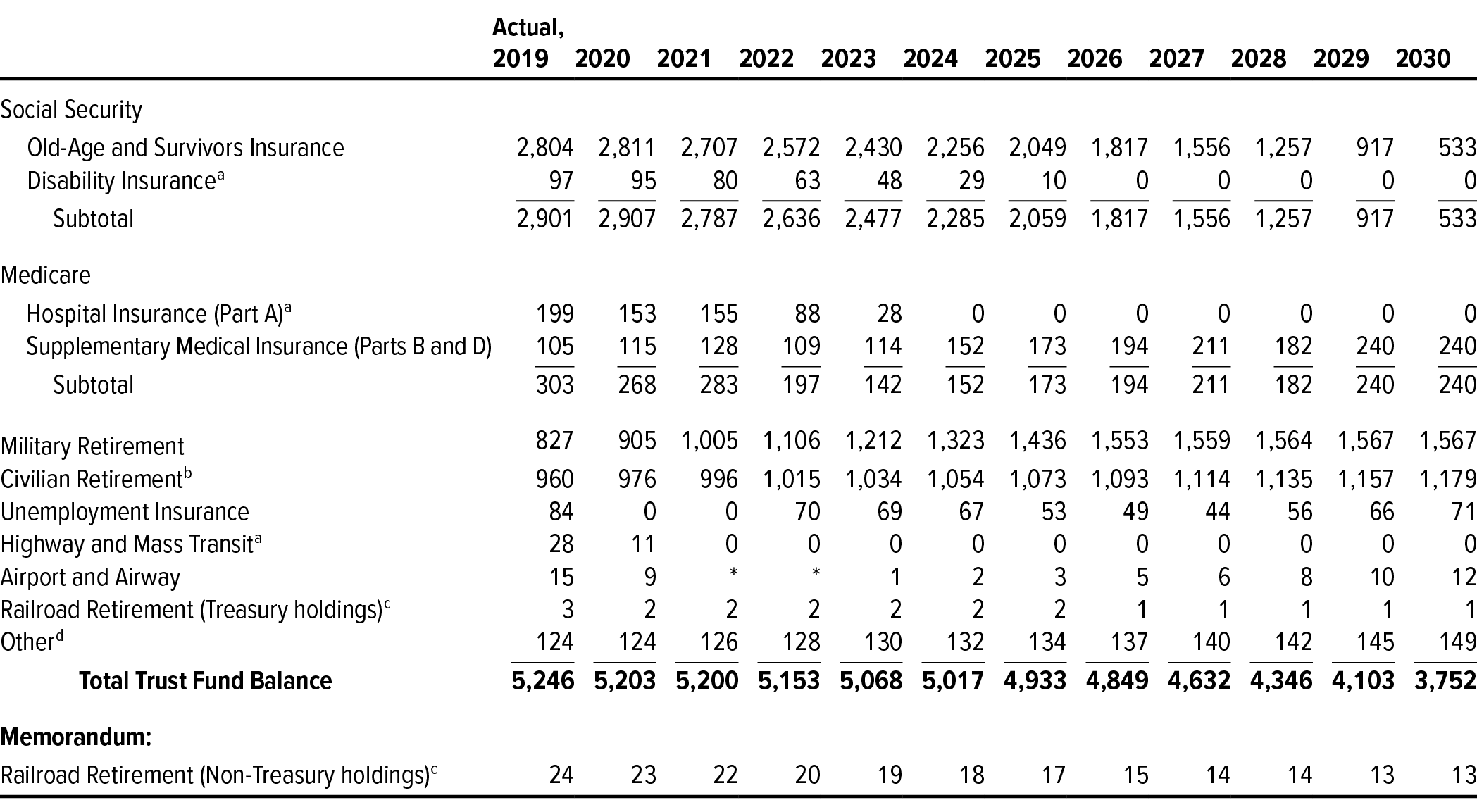 a. In keeping with the rules in section 257 of the Balanced Budget and Emergency Deficit Control Act of 1985, CBO’s baseline incorporates the assumption that scheduled payments will continue to be made in full after the trust fund has been exhausted, although there is no legal authority to make such payments. Because the manner in which those payments continued would depend on future legislation, the table shows zero rather than a cumulative negative balance in the trust fund after the exhaustion date.