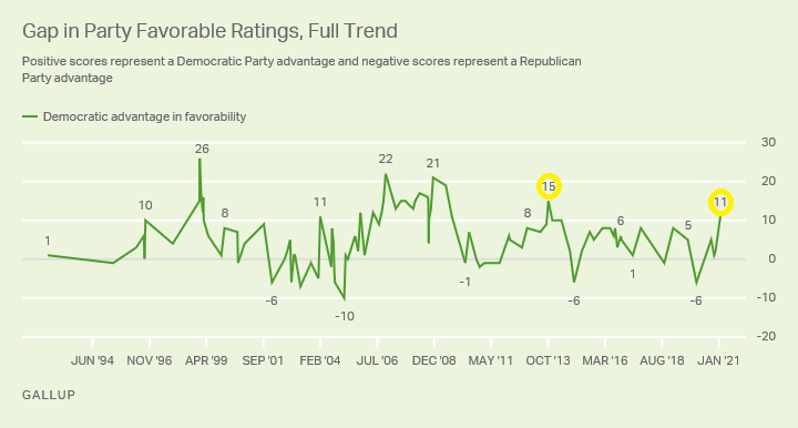 November 2020 February 2021 Change % % Pct. Pts. U.S. adults 43 37 -6 Republicans 90 78 -12 Independents 33 32 -1 Democrats 9 10 +1 Gallup - 一方の民主党の好感度は、45%から48%へと、わずか3%ポイントの上昇となった。