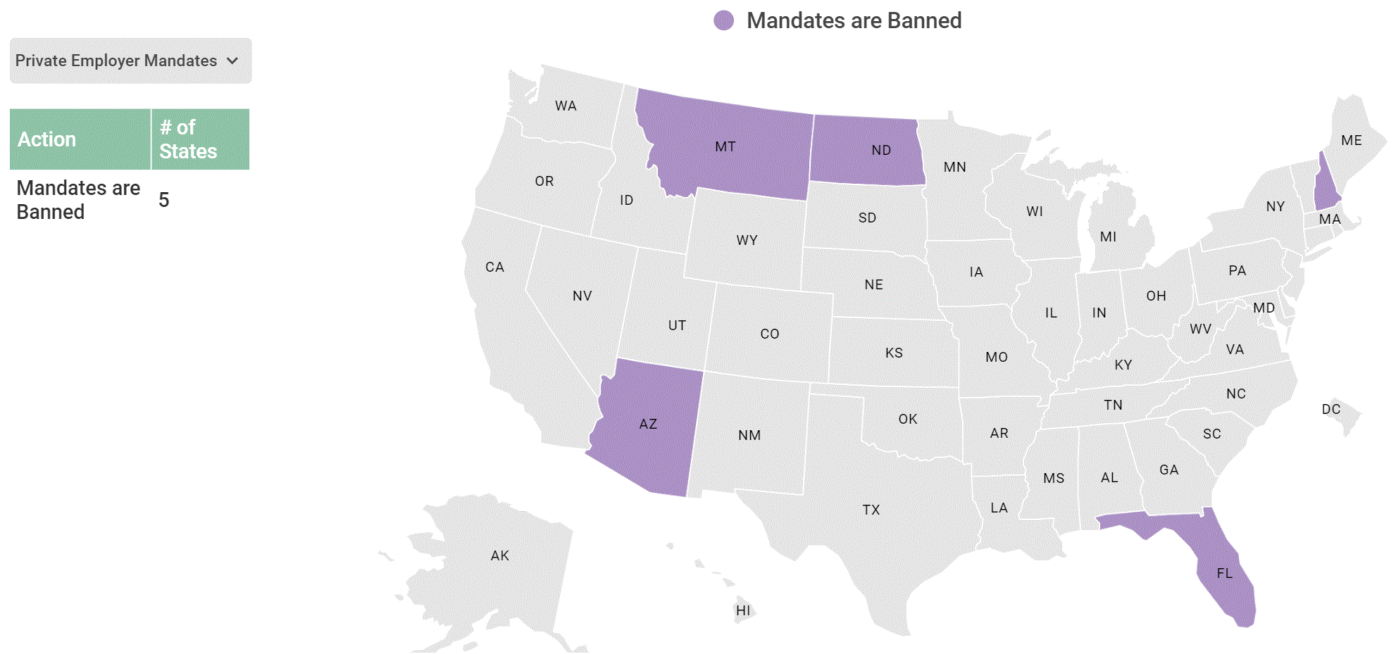 AZ州が民間企業のワクチン接種義務化を容認した。一方、接種義務化を禁止する州が5から3に減少した。- 州政府職員のワクチン接種義務化:19州(←20日:17州)