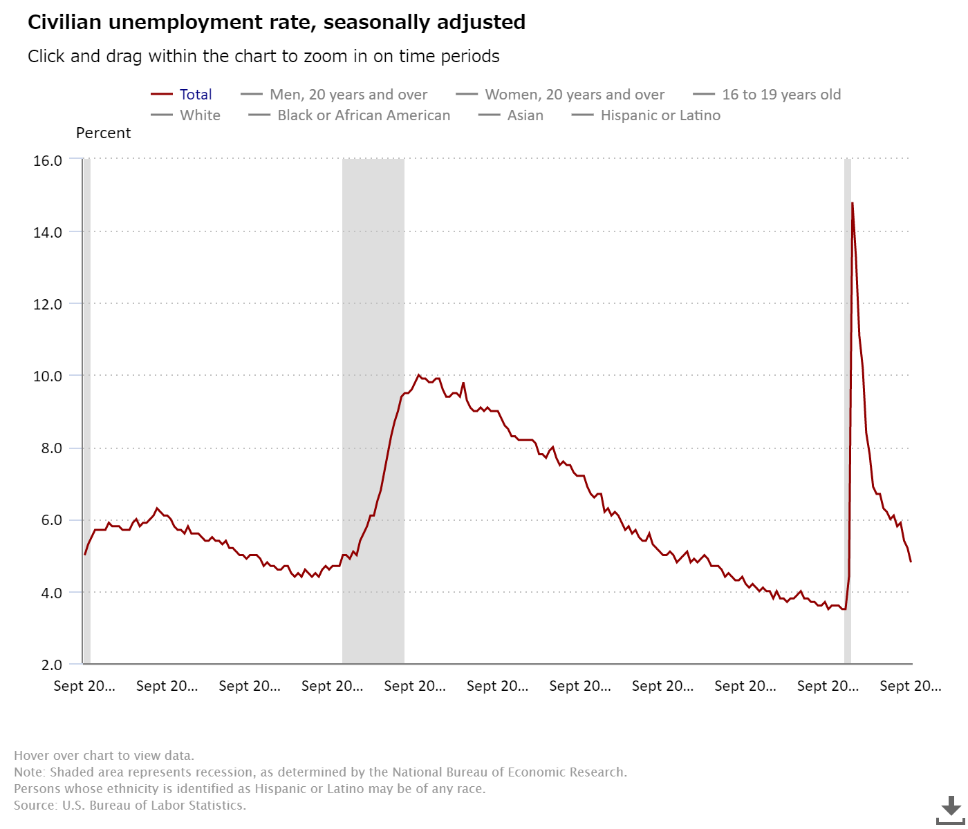 10月6日、労働統計が公表された(BLS)。9月の雇用増は19.4万人と、8月に続いて急ブレーキがかかっている(「Topics2021年9月4日 雇用増幅急落」参照)。サービス、レジャー関連が増加している。失業率は4.8%と、8月から0.4%ポイント低下した。こちらは順調に低下し続けている。パンデミック発生以前に較べて、依然として500万の雇用が回復していない。長期失業者(27週以上)の割合は34.5%と、先月の37.4%から低下したが、相変わらず高止まりしている。加えて、労働市場参加率も61.6%と、完全に横ばい状態が続いている。特に、女性の参加率の低迷が目立つ。労働市場は逼迫状態になっている一方、労働者の市場参加が進まない。学校が再開されても、失業保険加算給付が終了しても、労働市場に戻ってこないのである。