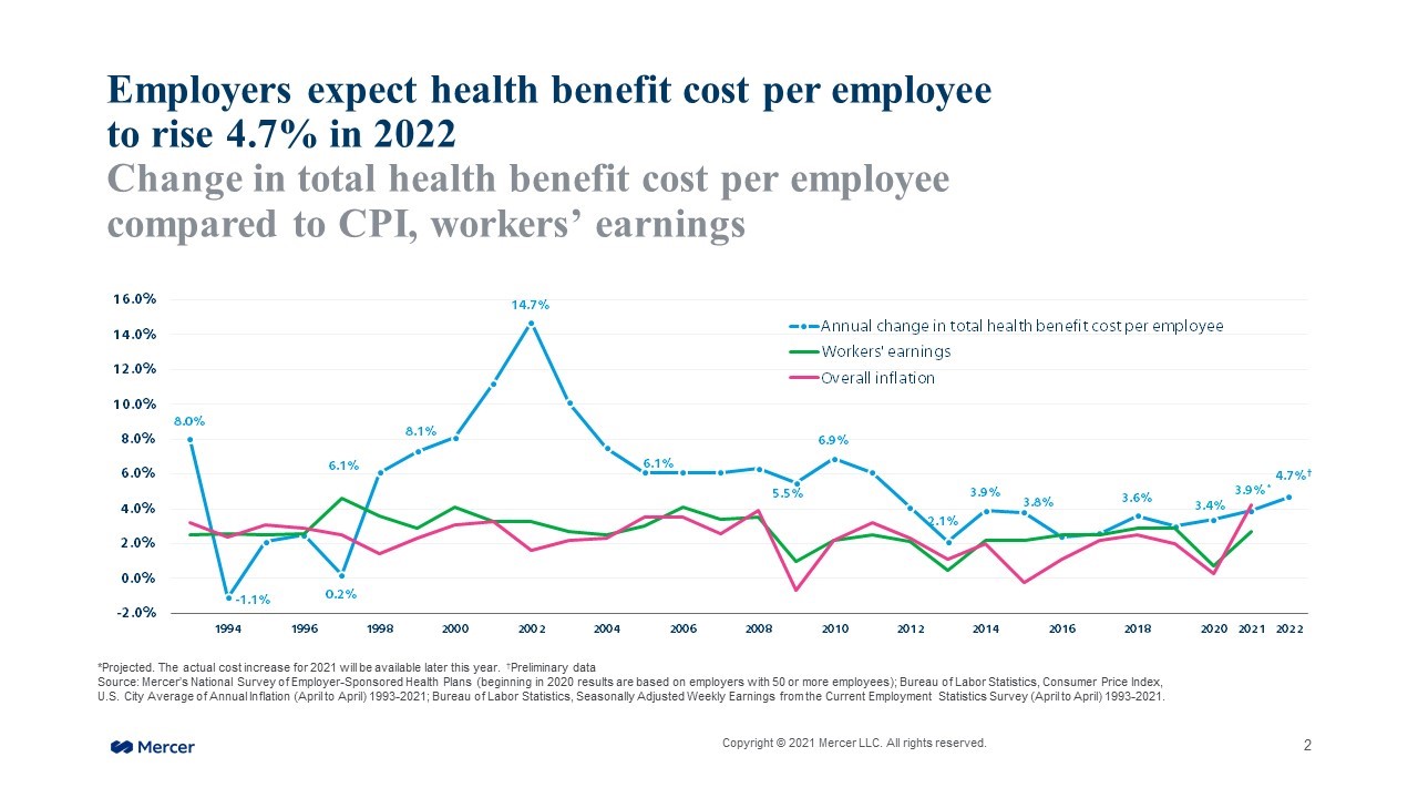 | Source : | Employers expect a 4.7% increase in health benefit costs for 2022 as they focus on improving employee benefits rather than cost-cutting, Mercer survey finds (Mercer) |
