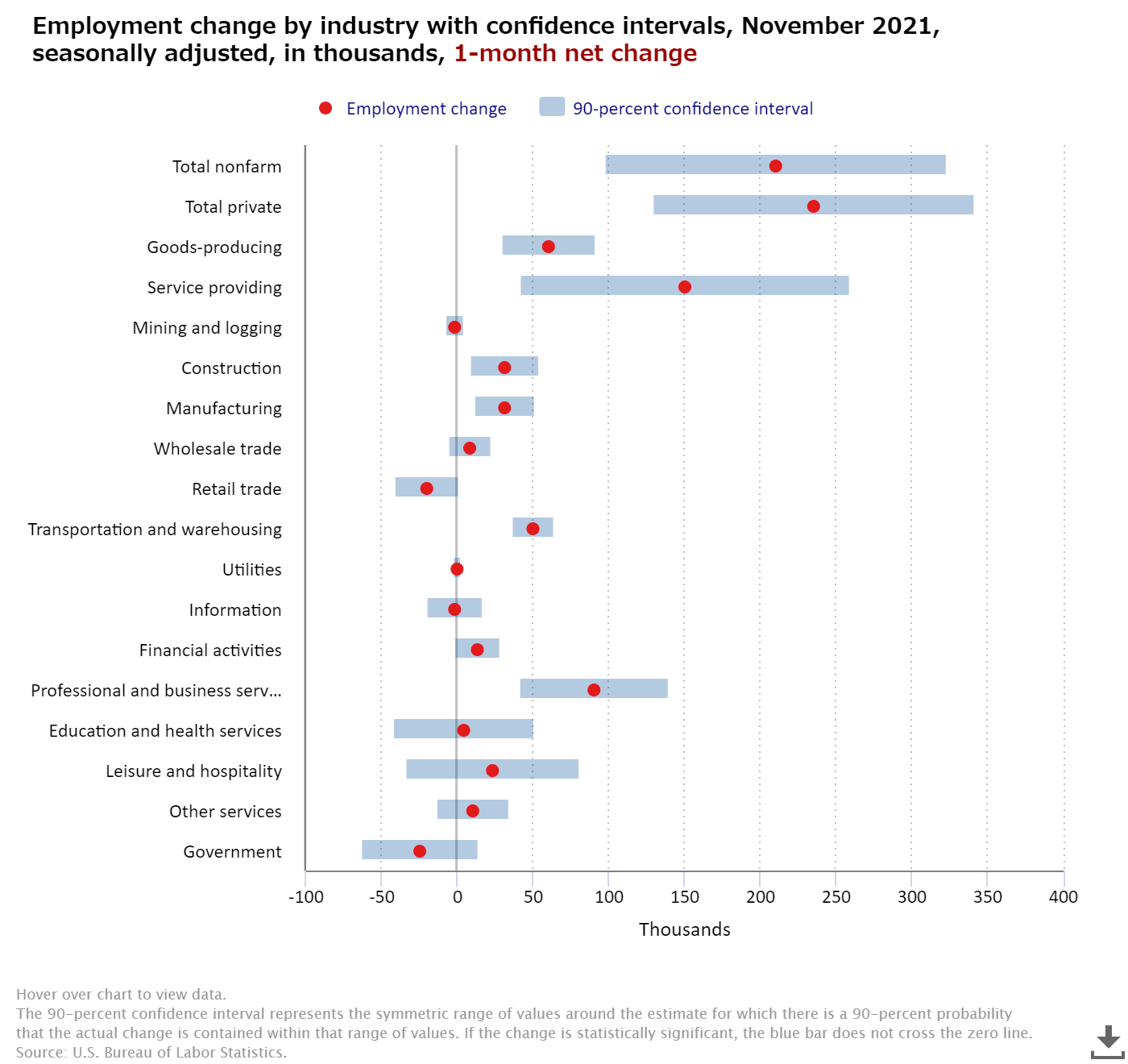 12月3日、労働統計が公表された(BLS)。11月の雇用増は21.0万人となり、10月の54.6万人から急落した(「Topics2021年11月7日(2) 労働市場参加率低迷」参照)。