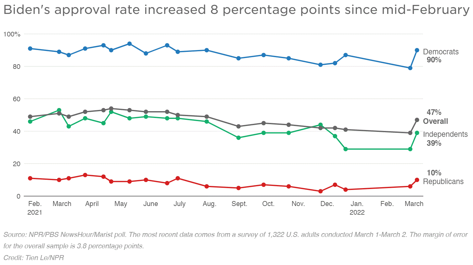 3月1日、バイデン大統領の一般教書演説が行なわれた(「Topics2022年3月3日 バイデン初の一般教書演説」参照)。その直後に行われたNPR世論調査で、バイデン大統領への支持率が8%跳ね上がって47%となった。特に、ロシアのウクライナ侵攻への対応が、主に民主党支持者の間で高く評価されている。しかし、昨年夏に失った支持を回復するまでには至っていないようだ。※ 参考テーマ「政治/外交」、「一般教書演説」