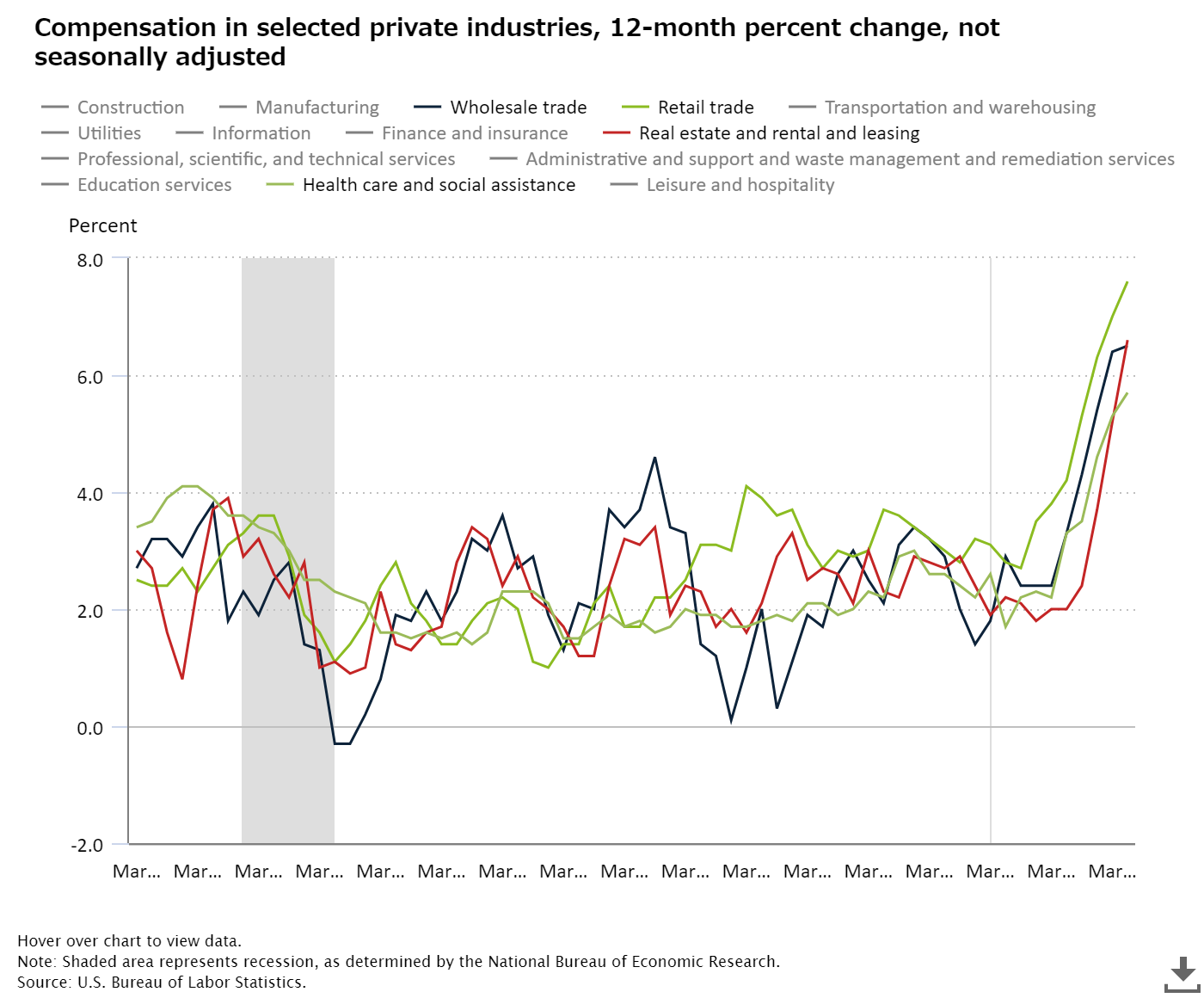 - Wages and salariesの伸びが顕著な業種は、小売業、不動産業、卸売業、医療・福祉となっている。