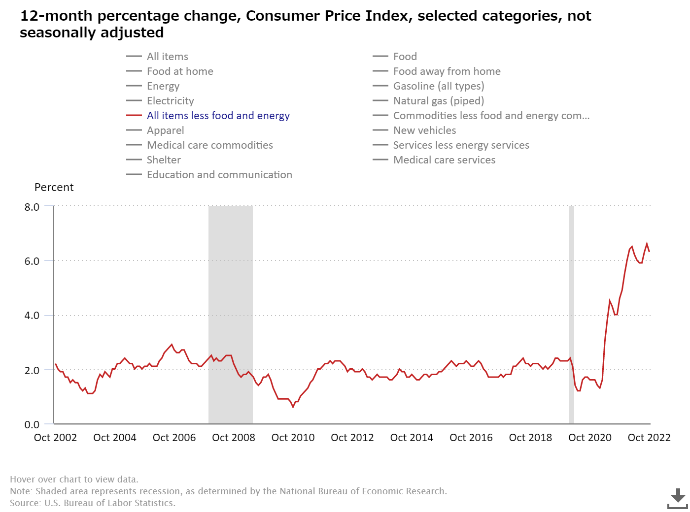 11月10日、BLSは今年10月の消費者物価指数(CPI-U)を公表した(News Release)。前年同月比7.7%の上昇と、3ヵ月連続の伸び率低下となった。今年3月からずっと8%台だったものが、ようやく7%台に低下した。8月の8.3%からわずかに低下した。前月比では0.4%上昇となり、9月と同水準を保っている(「Topics2022年10月14日(1) CPI加速が止まらない」参照)。エネルギー全体の価格上昇率は前年同月比17.6%と、伸び率の低下が続いている。一方、食料品の価格は、前年同月比10.9%増と2ヵ月連続の微減となった。依然として高い水準が続いている。エネルギー、食料品を除くCPI上昇率は前年同月比6.3%と、前月よりも若干低下したが、上昇率の高まりが続いてる。住居費も前年比6.9%増と、上昇率の高まりが止まらない。10月の実質時給は、前月比0.1%減、前年同月比で2.8%減となった(Real Earnings News Release)。CPI上昇率は、確かに8%は切ったものの、まだまだ高水準である。にもかかわらず、FRBの利上げペースが若干鈍化するとの見通しから株価は急騰した(日経『NY株ハイライト インフレ鈍化に歓喜、底入れ期待広がる』)。また、続いていた円安が一転、円高報告に推移している(日経『円、大幅上昇 141円台後半 米インフレ鈍化で』)。インフレの鎮静化が明確になったわけではないのに、ちょっとはしゃぎ過ぎではないだろうか。