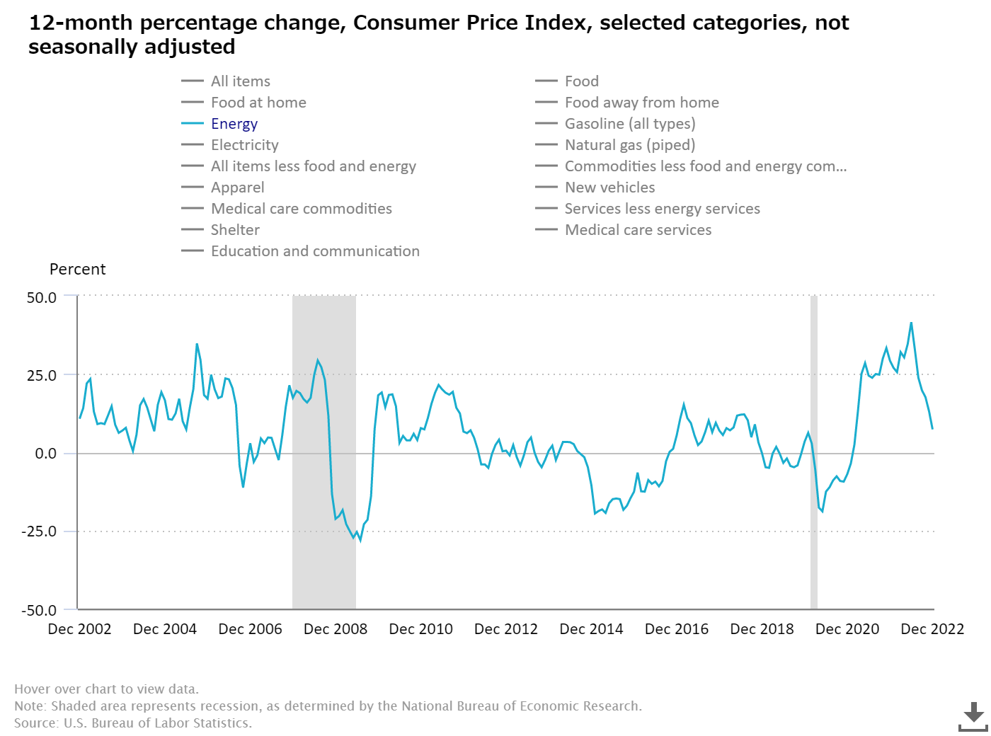 1月12日、BLSは昨年12月の消費者物価指数(CPI-U)を公表した(News Release)。前年同月比6.5%の上昇と、6ヵ月連続の伸び率低下となった(「Topics2022年12月14日(2) CPI7.1%に低下」参照)。また、前月比では久々に低下し、-0.1%となった。前月比でマイナスになった主な要因は、ガソリン価格の低下である。エネルギー全体の価格指数も前年同月比で伸び率は大幅に低下しているが、それでも7.3%の伸びとなっている。一方、食料品価格の伸び率は、前年同月比10.4%増と4ヵ月連続の微減となったものの、依然として高い水準が続いている。上図でもわかるように、卵の値上がりが激しく、話題になっている。エネルギー、食料品を除くCPI上昇率は前年同月比5.7%と、若干の低下が続いているが、依然として高水準の上昇率である。住居費は前年比7.5%増と、上昇率の高まりが止まらない。12月の実質時給は、前月比0.4%増、前年同月比で1.7%減となった(Real Earnings News Release)。こうした状況に対して、Federal Reserve Bank of San FranciscoのMary Daly総裁は、次のように述べている。"That's encouraging, but not enough to declare "mission accomplished". I don't think we should declare victory on inflation, on the labor market, on any of the things that we're seeing, based on one month of data."FRBの厳しい姿勢は続きそうである(「Topics2022年12月16日 FRB引締め姿勢堅持」参照)。