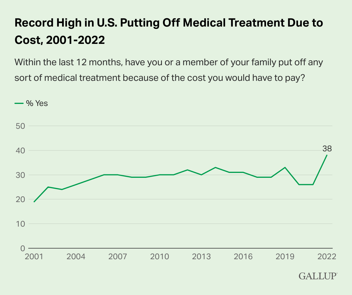 | Source : | Record High in U.S. Put Off Medical Care Due to Cost in 2022 (GALLUP) |