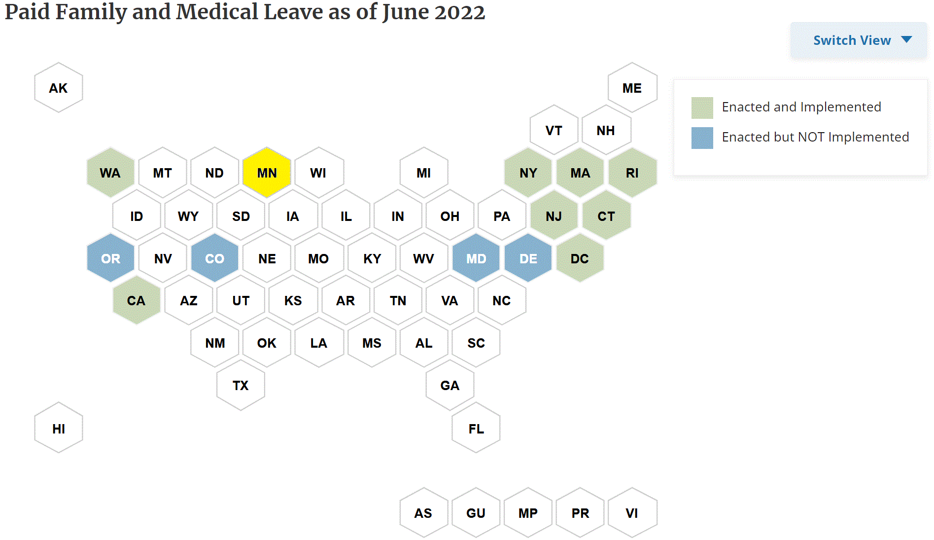 5月25日、Minnesota州(MN)でFMLA(HB 2)が成立した。これで、12州+D.C.でFMLPが導入されたことになる。制度の概要ポイントは次の通り。