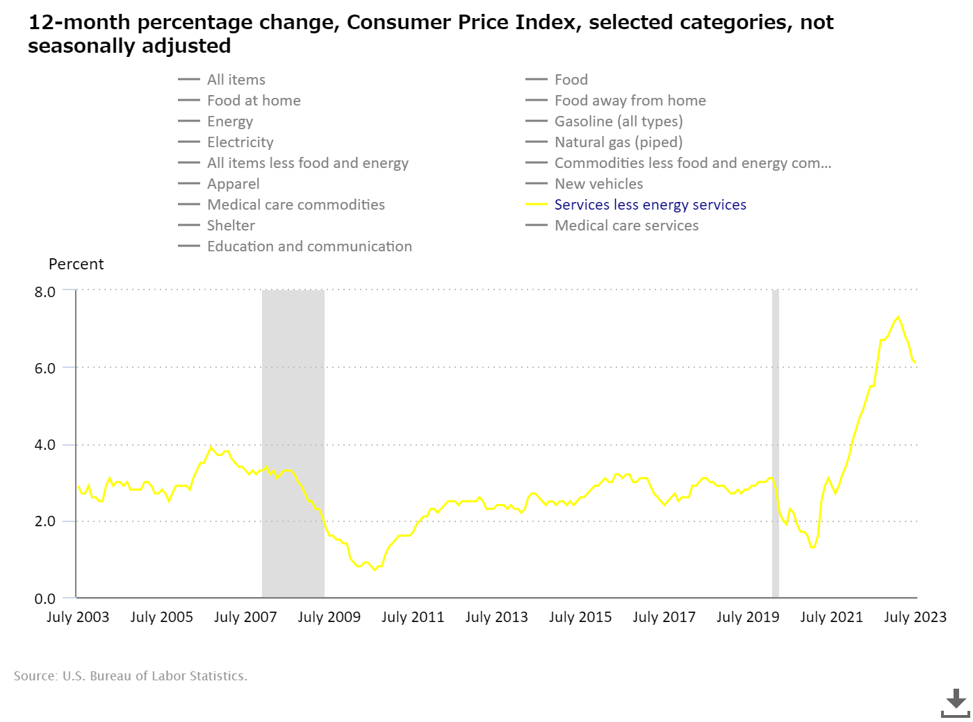 8月10日、BLSは7月の消費者物価指数(CPI-U)を公表した(News Release)。前年同月比3.2%の上昇と、若干の上昇となった(「Topics2023年7月13日(2) CPI3.0%」参照)。コアの伸び率は4.7%と若干の低下、足許については、前月比で+0.2%と横ばいだった。エネルギー全体の価格指数は、前年同月比で伸び率はマイナス12.5%となり、大幅な価格低下が続いている。食料品価格の伸び率は前年同月比4.%増と低下しており、だいぶ落ち着いてきた感じである。航空運賃、卵などの低下が目立つ。エネルギー、食料品を除くCPI上昇率は前年同月比4.8%と、低下の度合いが小さい。住居費は前年比7.8%増と、わずかに下がったものの、高水準が続いている。家賃は逆に上昇している。サービス業の価格上昇率は6.1%と僅かに低下したものの、高い水準を続けている。労働需要の高いことを反映している(「Topics2023年8月7日 労働供給が限界か?」参照)。7月の実質時給は、前月比0.3%、前年同月比で1.1%となった(Real Earnings News Release)。※ 参考テーマ「労働市場」