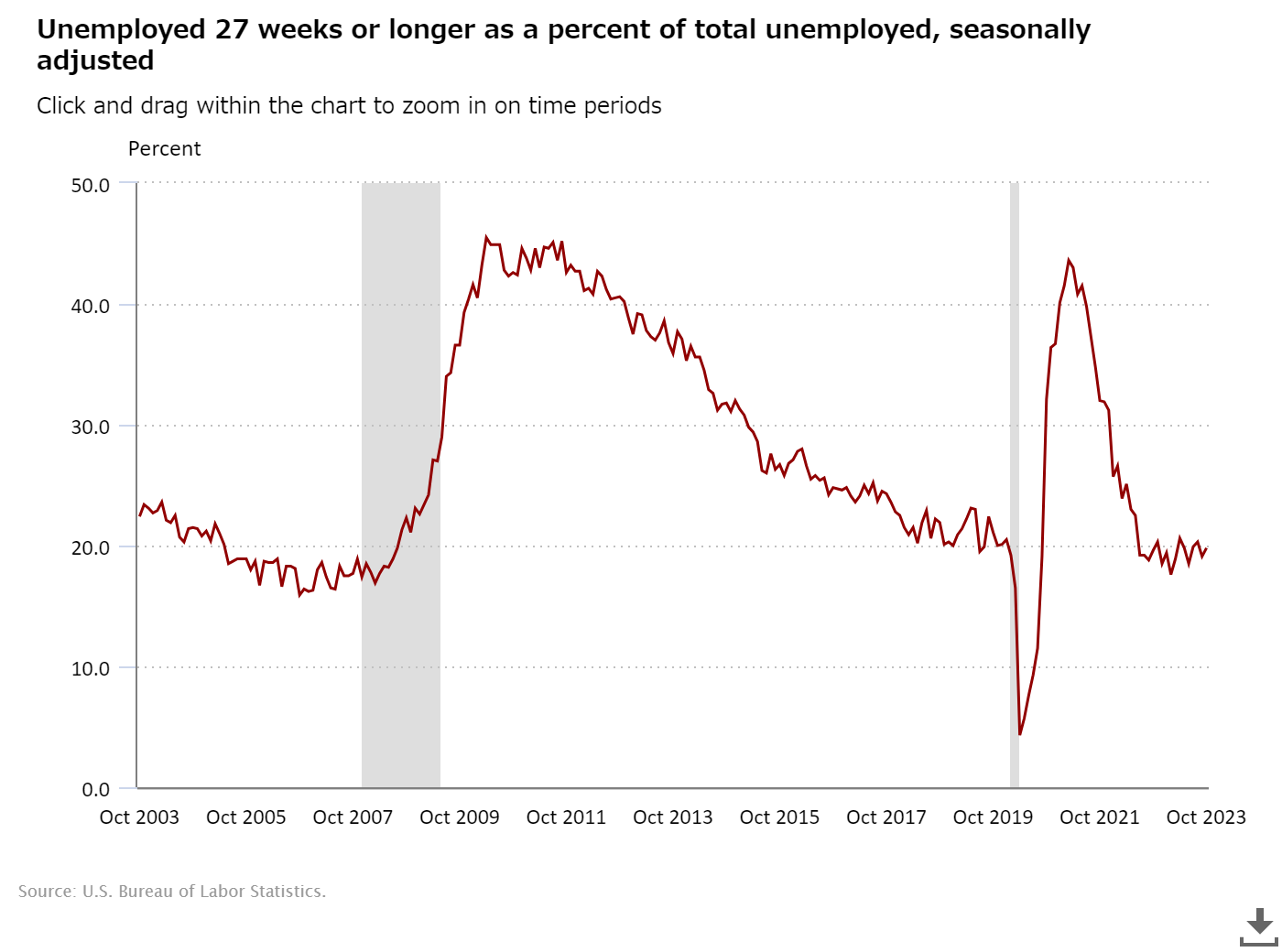 11月3日、雇用統計が公表された(BLS)。10月の雇用増は15.0万人となった(「Topics2023年10月9日(3) 労働需要は依然強い」参照)。雇用者数は156.9M人となった(Table B-1. Employees on nonfarm payrolls by industry sector and selected industry detail)。業種別増加数は次の通り。若干勢いは弱まったものの、相変わらずサービス業での需要が高い。失業率は3.9%で0.1ppt上昇した(Table A-1. Employment status of the civilian population by sex and age)。労働市場参加率は今月も62.7%とわずかに低下。依然として、コロナ禍以前と比べて低水準が続いている。25~54歳の労働市場参加率も83.3%で0.2ppt低下(BLS)。労働市場に参加していない人の中で仕事を得たいと考えている人数も減少した。長期失業者(27週以上)の失業者全体に占める割合は、19.8%と上昇した。全体的にUAWの長期ストが影響をもたらしたようだ(「Topics2023年10月30日(1) Ford, Stellantis暫定合意」参照)。