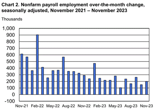 12月8日、雇用統計が公表された(BLS)。11月の雇用増は19.9万人となった(「Topics2023年11月4日 ストが雇用統計に影響」参照)。雇用者数は157.1M人となった(Table B-1. Employees on nonfarm payrolls by industry sector and selected industry detail)。業種別増加数は次の通り。若干勢いは弱まったものの、相変わらずサービス業での需要が高い。失業率は3.7%で0.2ppt低下した(Table A-1. Employment status of the civilian population by sex and age)。労働市場参加率は今月も62.8%とわずかに上昇。依然として、コロナ禍以前と比べて低水準が続いている。25~54歳の労働市場参加率は83.3%で横ばい(BLS)。労働市場に参加していない人の中で仕事を得たいと考えている人数は引き続き減少した。長期失業者(27週以上)の失業者全体に占める割合は、18.3%に低下した。※ 参考テーマ「労働市場」
