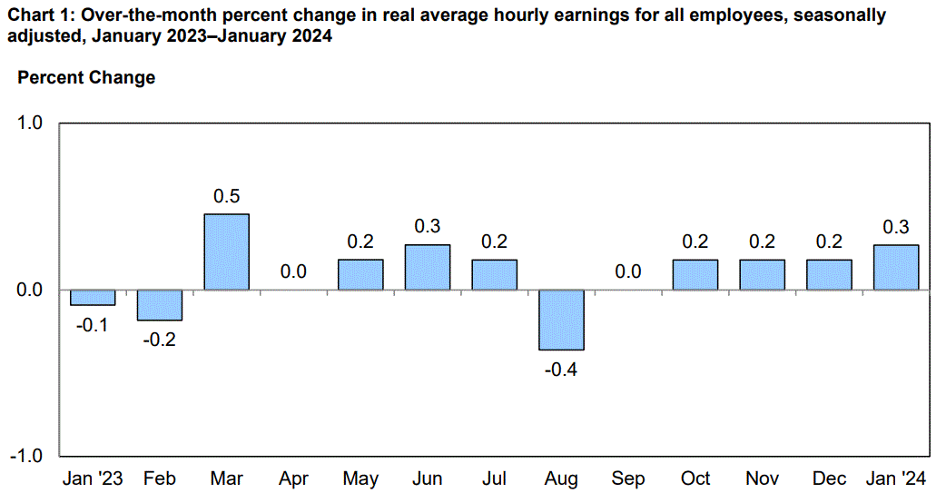 2月13日、BLSは1月の消費者物価指数(CPI-U)を公表した(News Release)。前年同月比3.1%の上昇と、再び3%近傍に低下した(「Topics2024年1月12日 住宅/サービス価格上昇続く(2)」参照)。コアの伸び率は3.9%と横ばいで、4%近傍からなかなか下がらない。足許については前月比で+0.3%と、徐々に上昇しつつある。エネルギー価格はマイナスを続けている。住居費は前年同月比6.0%増と低下したものの、相変わらず高水準の伸び率が続いている。サービス業の価格上昇率は5.4%と若干上昇し、依然として高い水準を続けている(「Topics2024年2月3日(1) 雇用大幅増」参照)。1月の実質時給は、前月比0.3%増、前年同月比で+1.4%となった(Real Earnings News Release)。上記sourceは、FRBが政策金利を下げやすい環境に近づいたとしている。しかしながら、サービス価格上昇率の水準が高く雇用需要が高いこと、足許の物価上昇率がむしろ高まっていることなど、政策金利の据え置き要因も増えている。