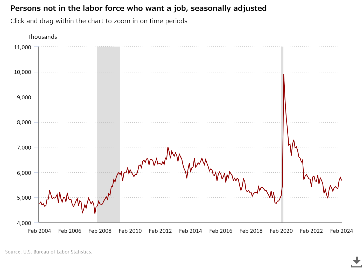 3月8日、雇用統計が公表された(BLS)。2月の雇用増は27.5万人と、市場の予測を大幅に上回る増加となった(「Topics2024年2月3日(1) 雇用大幅増」参照)。なお、12月、1月の増加幅は、合計で16.7万人分下方修正となった。雇用者数は157.8M人となった(Table B-1. Employees on nonfarm payrolls by industry sector and selected industry detail)。業種別増加数は次の通り。相変わらずサービス業での需要が高い。上記sourceによれば、医療6.7万人増、政府・自治体5.2万人増、レストラン・バー4.2万人増、建設2.3万人増、小売業1.9万人増となった。失業率は3.9%で若干の高まり(Table A-1. Employment status of the civilian population by sex and age)。25ヵ月連続して4.0%を下回っており、1960年代以来のことだそうだ。労働市場参加率は今月62.7%に上昇。25~54歳の労働市場参加率は83.5%とわずかに上昇(BLS)。労働市場に参加していない人の中で仕事を得たいと考えている人数は僅かに減少した。長期失業者(27週以上)の失業者全体に占める割合は、18.7%と大きく減少した。雇用増加が強いながらも少し落ち着いてきている一方、物価も落ち着きつつある(「Topics2024年2月15日(1) CPI3%近傍」参照)。安心して政策金利を引き下げられる環境になってきた。