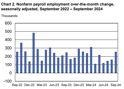 10月4日、雇用統計が公表された(BLS)。7月、8月合わせて7.2万人の上方修正のうえで、9月の雇用増は25.4万人となった(「Topics2024年9月7日 雇用指標は緩やかに改善」参照)。直近3ヵ月平均で、18.6万人の増加となり、下の図を見ると、雇用増の傾向が続いているように見える。雇用者数は159.1M人となった(Table B-1. Employees on nonfarm payrolls by industry sector and selected industry detail)。業種別増加数は次の通り。相変わらずサービス業での需要が高い。プラスに寄与しているのは、レストラン、小売り業、建設業。失業率は再び低下し、4.1%になった(Table A-1. Employment status of the civilian population by sex and age)。労働市場参加率は今月も62.7%と横ばい。25~54歳の労働市場参加率は83.8%と、微減となった(BLS)。労働市場に参加していない人の中で仕事を得たいと考えている人数は、若干増が続いている。長期失業者(27週以上)の失業者全体に占める割合は、23.7%と上昇した。今回の雇用統計は、着実な雇用増を示している。次のFOMCは9月17~18日である。