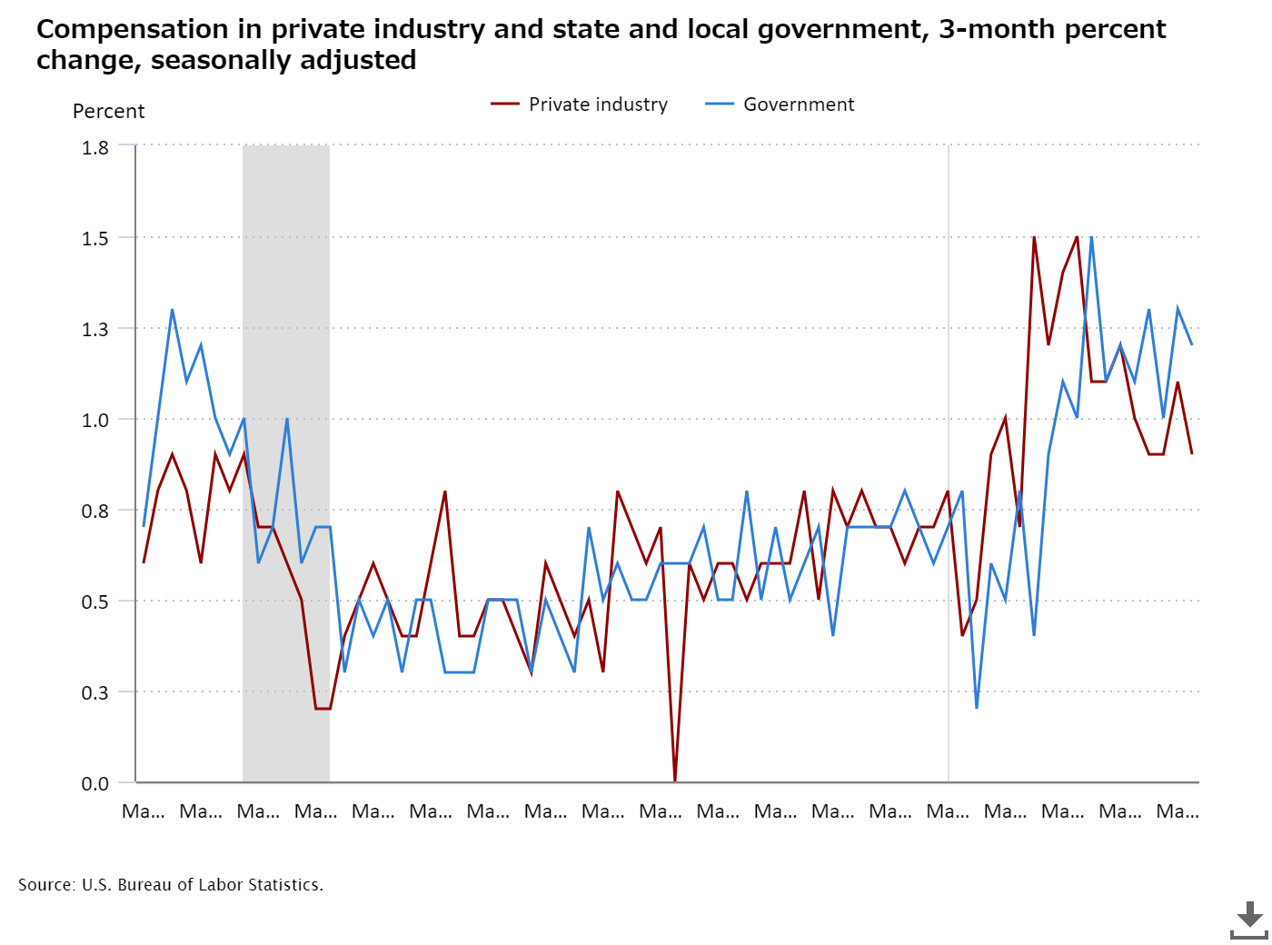 - 民間セクターの賃金の伸び率は、低下基調を続けている。