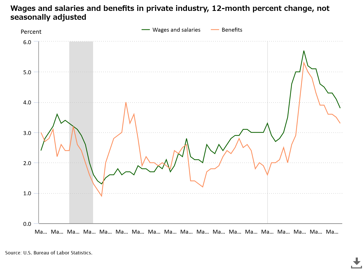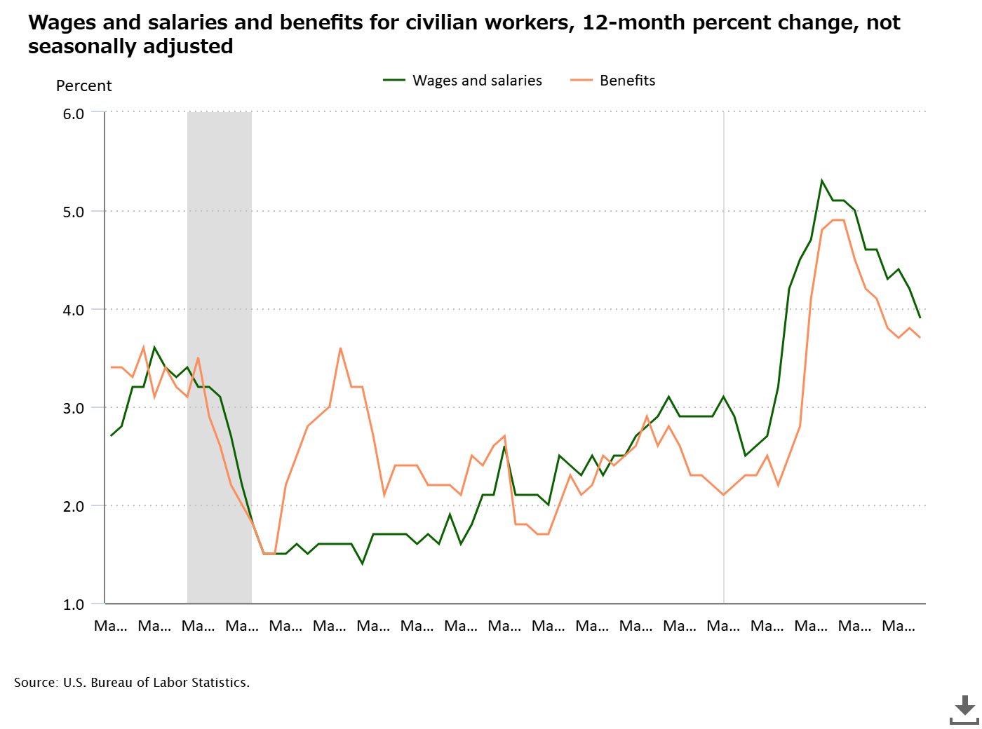 - 雇用市場全体の雇用コストは前年同期比3.9%増と、伸び率の低下が続いている(「Topics2024年8月1日(2) ECI伸び率4.1%」参照)。