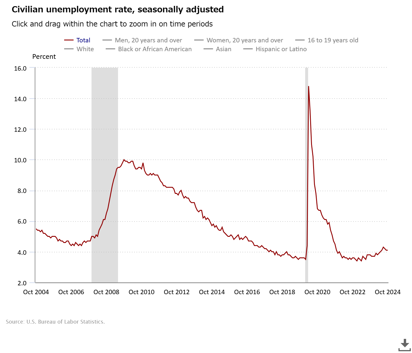 11月1日、雇用統計が公表された(BLS)。8月、9月合わせて11.2万人の下方修正のうえで、10月の雇用増はわずか1.2万人となった(「Topics2024年10月6日 着実な雇用増」参照)。ただし、上記sourceによれば、ボーイング社でのストライキと、2つのハリケーンによる災害が大きな要因とのことで、急速に労働市場の軟化が進んでいるわけではないようだ。雇用者数は159.0M人となった(Table B-1. Employees on nonfarm payrolls by industry sector and selected industry detail)。業種別増加数は次の通り。相変わらずサービス業での需要が高いものの、全般的な水準は低位にとどまっている。失業率は4.1%で横ばい(Table A-1. Employment status of the civilian population by sex and age)。労働市場参加率は今月も62.6%で僅かな低下。25~54歳の労働市場参加率は83.5%と、低下が続いている(BLS)。労働市場に参加していない人の中で仕事を得たいと考えている人数は、若干減少となった。長期失業者(27週以上)の失業者全体に占める割合は、22.9%と低下した。今回の雇用統計は、異常値として処理される可能性がある。次のFOMC(11月6~7日)でどのような判断が下されるのかを見ておきたい。