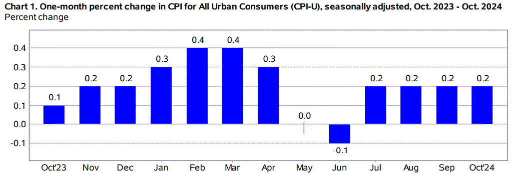 11月13日、BLSは10月の消費者物価指数(CPI-U)を公表した(News Release)。前年同月比2.6%の上昇となり、9月よりも伸び率は上昇した(「Topics2024年10月11日(1) インフレ鎮静化(2)」参照)。コアの伸び率は3.3%で横ばい。足許については前月比で0.2%で、4ヵ月連続で横ばいとなった。食料品価格は引き続き安定している。エネルギー価格も前年比で-4.9%と下落が続いている。住居費は前年同月比4.9%増と横ばい。なかなか低下してこない。サービス業の価格上昇率は4.8%と横ばい圏内で、なかなか低下してこない。10月の実質時給は、前月比0.1%増、前年同月比で1.4%増となった(Real Earnings News Release)。インフレの鎮静化は明確になってきたものの、住居費、サービス価格、医療費などの上昇が続いている。さらに、トランプ政権のもとでは、インフレ率が高まるのではないか、との警戒感が広がっている(「Topics2024年11月11日(1) FRB 1/4ppt引き下げ」参照)。