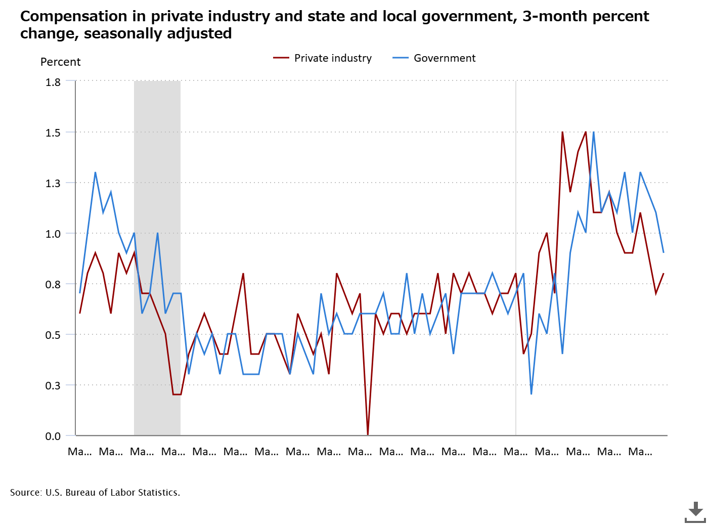 - 民間セクターの賃金の伸び率は、低下基調を続けている。