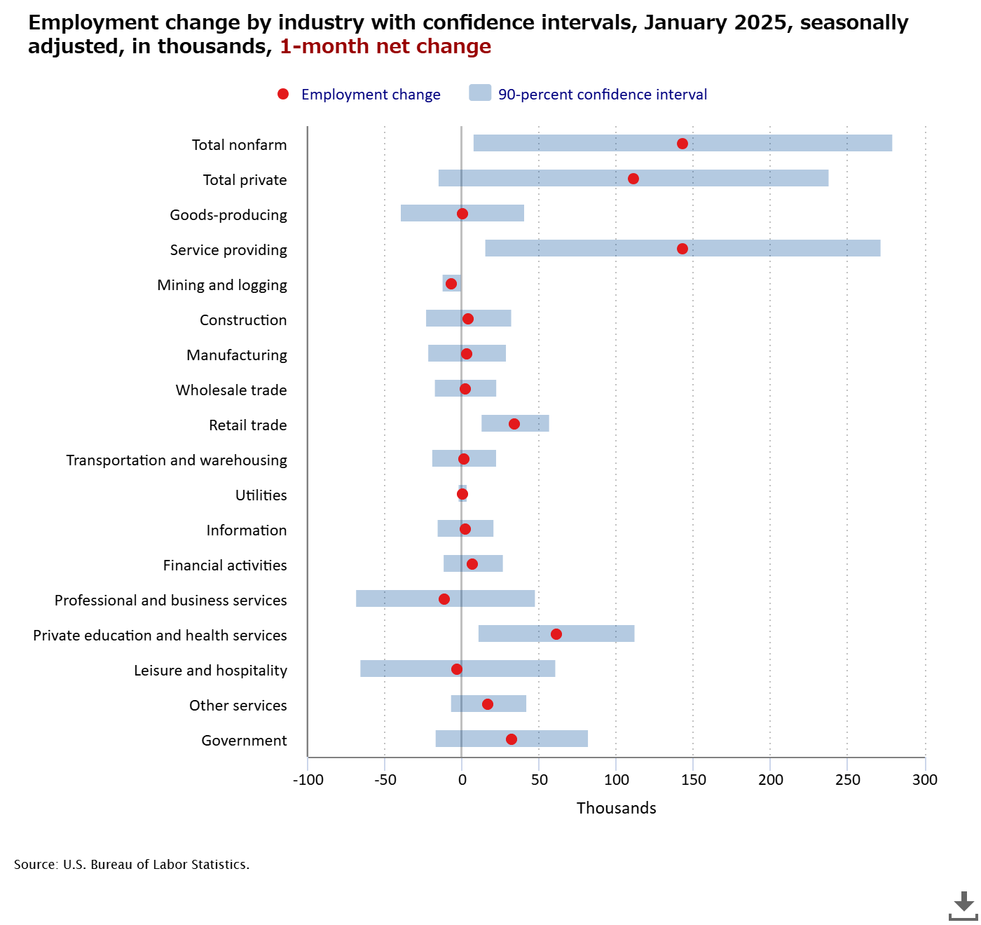 2月7日、雇用統計が公表された(BLS)。1月の雇用増は14.3万人となり、雇用増加の勢いが少しずつ和らいでいる(「Topics2025年1月13日 求人の強さを確認」参照)。雇用者数は170.7M人となった(Table B-1. Employees on nonfarm payrolls by industry sector and selected industry detail)。業種別増加数は次の通り。相変わらずサービス業での需要が高い。失業率は4.0%に低下した(Table A-1. Employment status of the civilian population by sex and age)。労働市場参加率は今月も62.6%と若干上昇した。25~54歳の労働市場参加率は83.5%とわずかに上昇(BLS)。労働市場に参加していない人の中で仕事を得たいと考えている人数は、わずかに減少。長期失業者(27週以上)の失業者全体に占める割合は、21.1%と低下を続けている。労働市場の需給は依然として締まっている感じである。