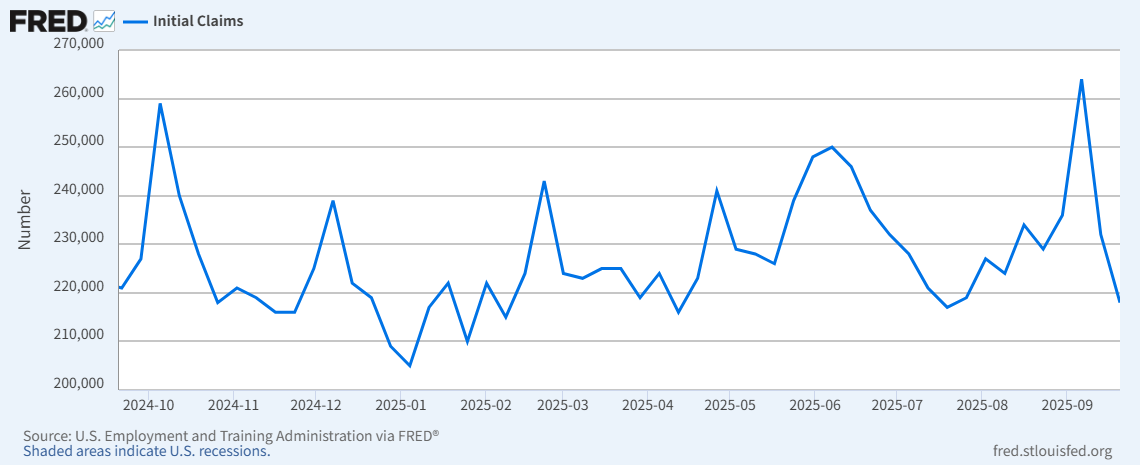 - 週末が9月20日の週の新規失業保険申請件数:21.8万人。2週連続の減少となった。