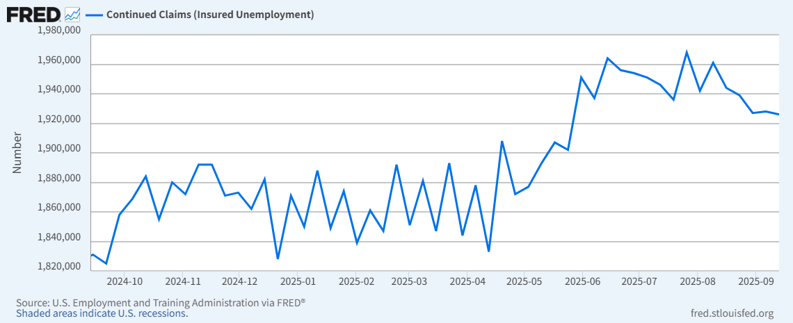 Federal Reserve Bank of St. Louis- 週末が9月20日の週の継続失業保険申請件数:192.6万人。こちらも緩やかな減少となっている。