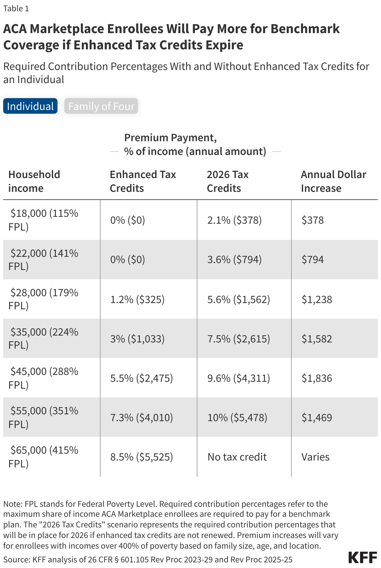 Source : | ACA Marketplace Premium Payments Would More than Double on Average Next Year if Enhanced Premium Tax Credits Expire (KFF) |