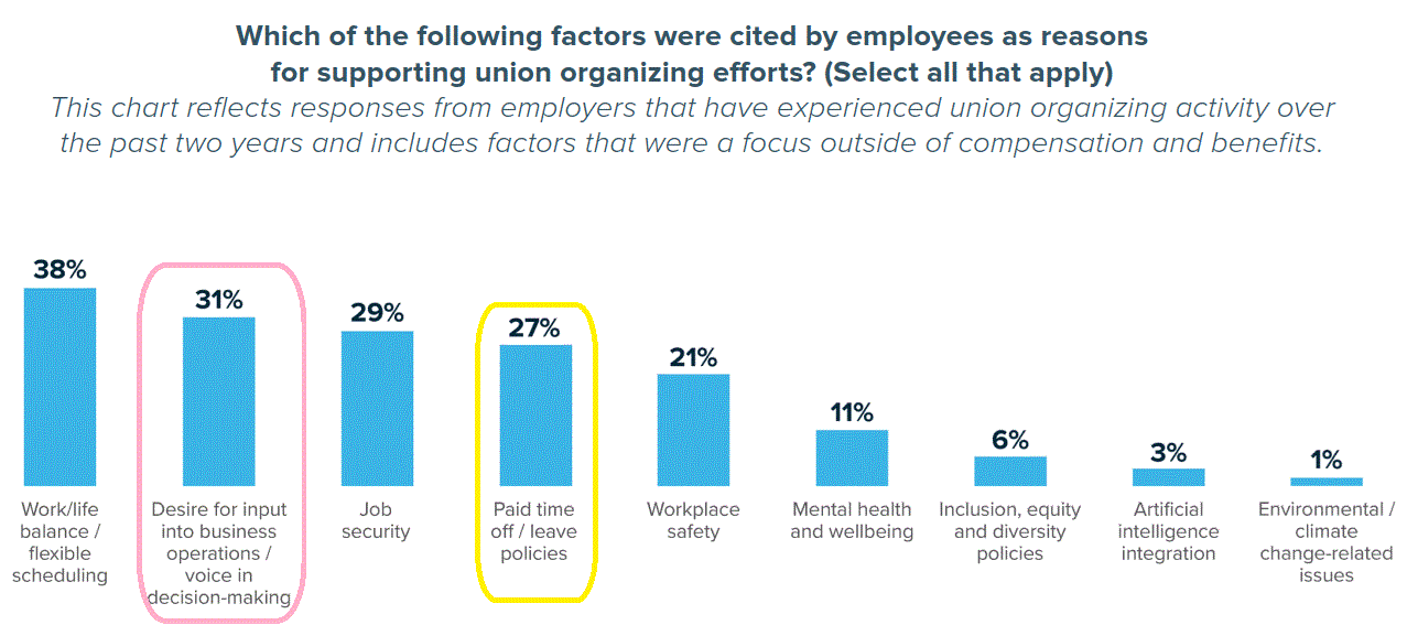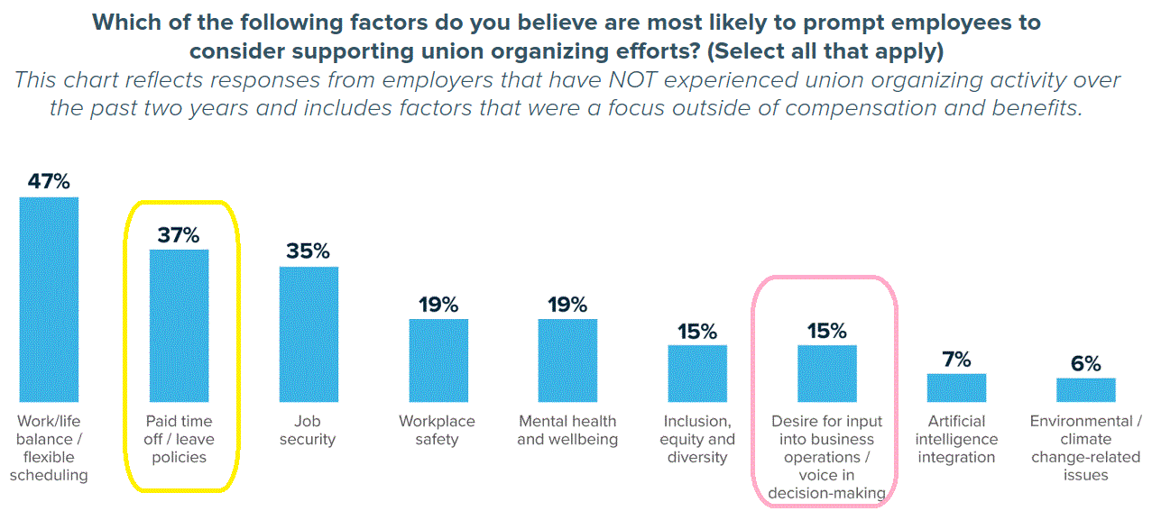 上記sourceでは、労組結成に対応する企業の考え方を調査した結果(Littler’s 2025 Labor Survey Report)を紹介している。その中で、印象に残ったのは、何が労組結成を促しているのか、との問いに対する経営側の回答である。従業員からは経営判断に参加したいと聞いていながら、それは本音ではなかろう、と考えている。また、休暇制度に対する従業員の要望は本当はもっと高いだろうと考えている。こうしたコミュニケーションギャップは、何らかの形で解消する努力を続けておく必要があるだろう。