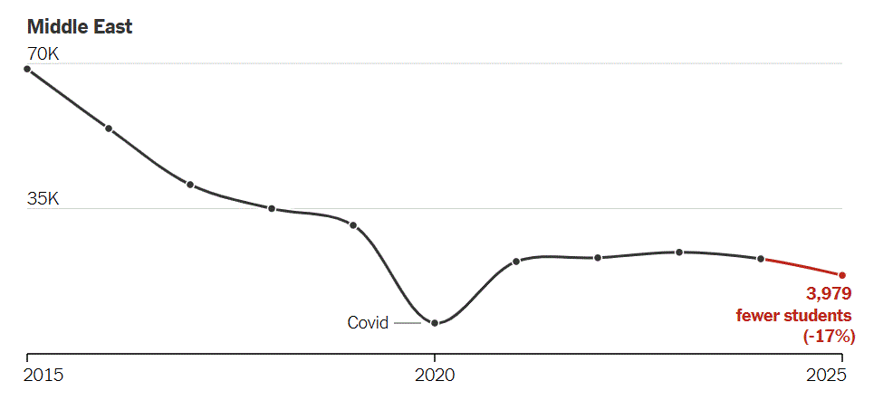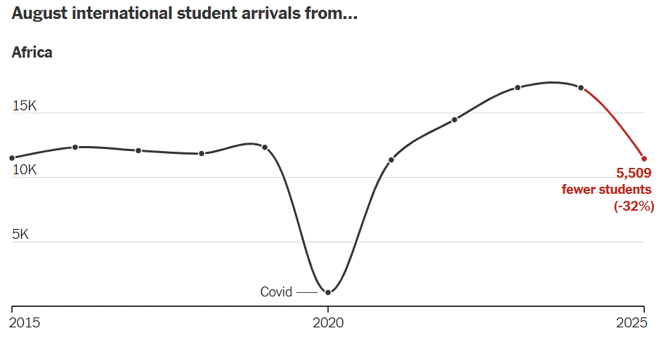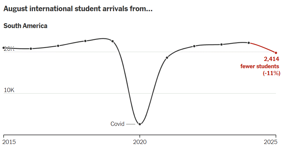 Source : | Nearly 20 Percent Fewer International Students Traveled to the U.S. in August (New York Times) |