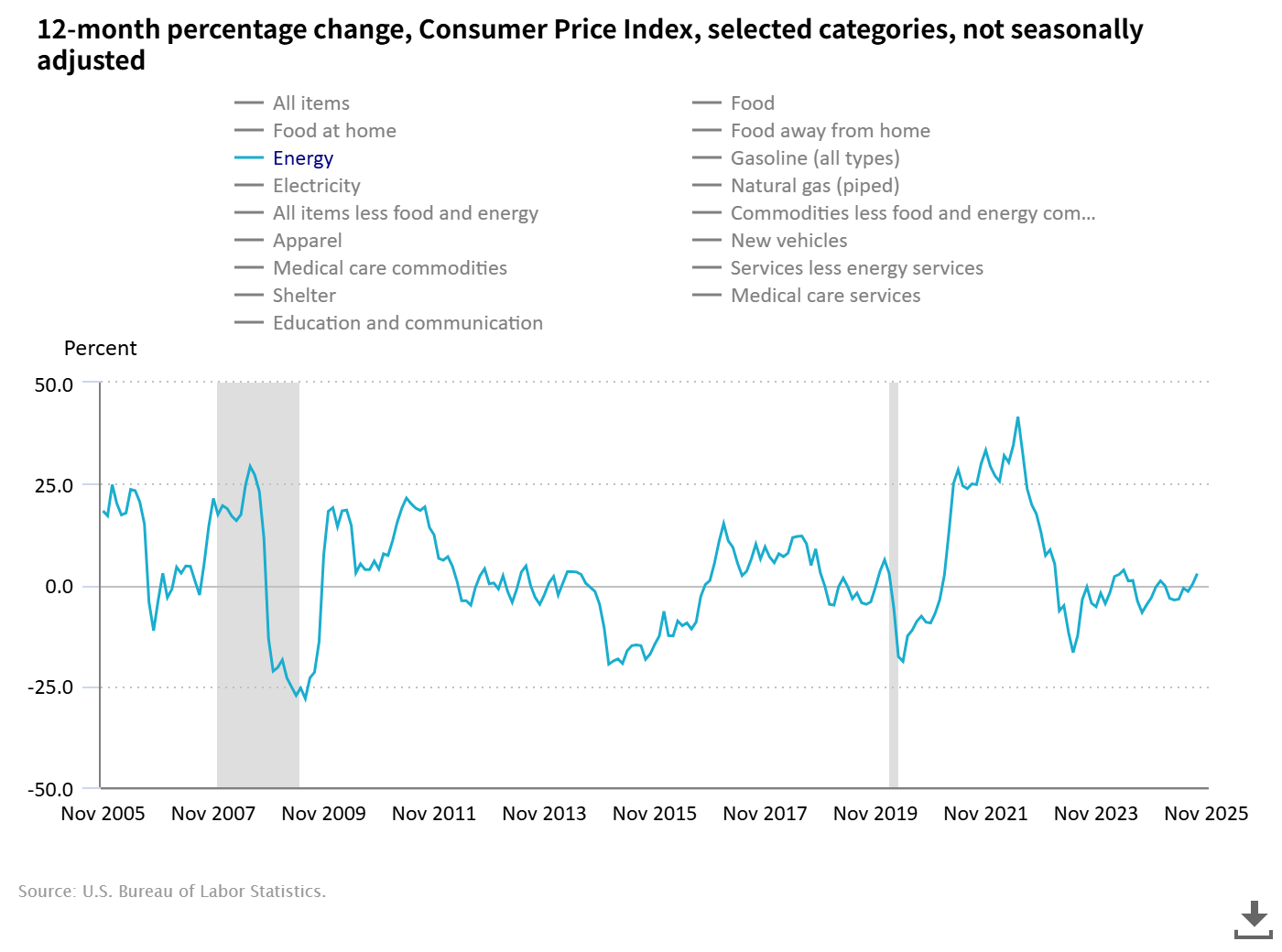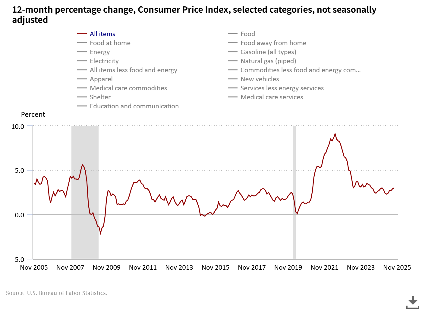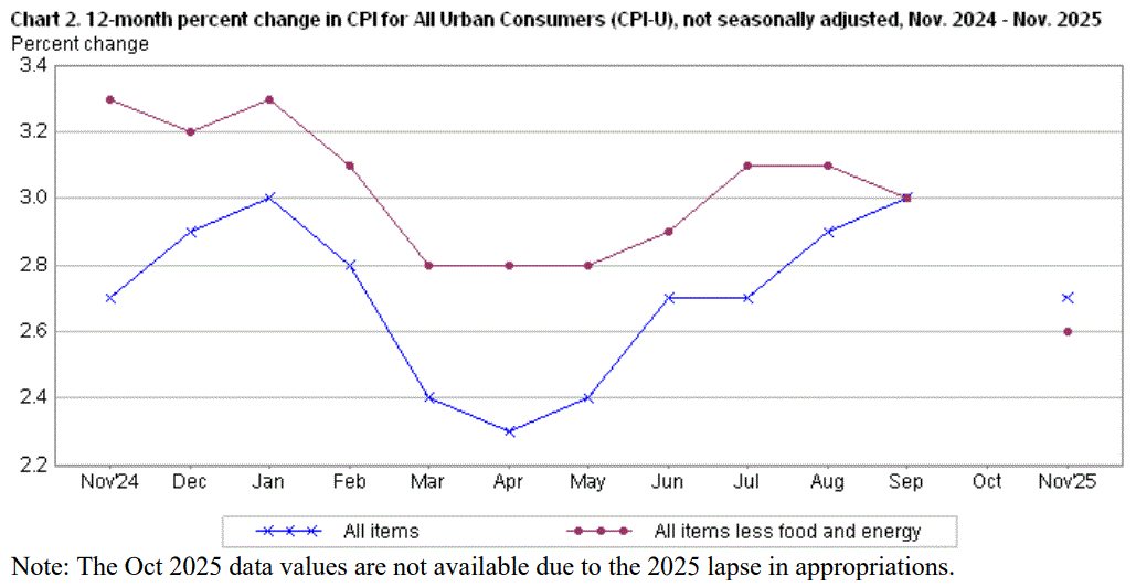 12月18日、BLSは11月の消費者物価指数(CPI-U)を公表した。前年同月比2.7%の上昇と、9月の上昇率から低下した(「Topics2025年11月22日(2) CPI上昇続くも」参照)。FRBの政策金利引き下げを裏付けるような結果となった(「Topics2025年12月12日(2) インフレ懸念>失業懸念」参照)。コアの伸び率は2.6%と低下した。なお、10月分の公表はない。足許については9月比でプラスの0.2と、若干の低下となった。