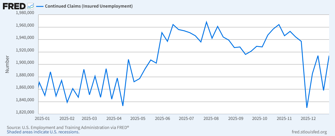 Federal Reserve Bank of St. Louis- 週末が12月13日の週の継続失業保険申請件数:191.4万人。こちらも一時期に比べるとどんどん積みあがっている状況にはないように見える。